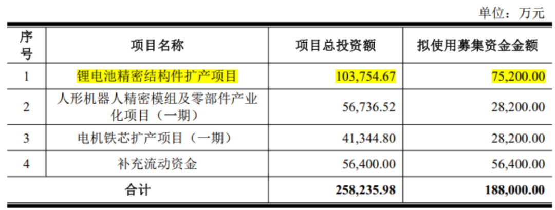 面对汹涌而来的订单,现有产能已逼近极限,92.73%的产能利用率足以显现。为此,震裕科技启动了新一轮募资扩产计划,计划募集18.8亿元。其中,拟拿出7.52亿元用于锂电池精密结构件扩产项目。