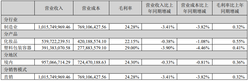 报告期内,嘉亨家化主要从事化妆品业务以及塑料包装容器业务。其中,化妆品业务实现营业收入5.40亿元,微减0.38%;塑料包装容器业务实现营业收入3.91亿元,同减3.90%。