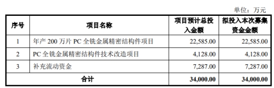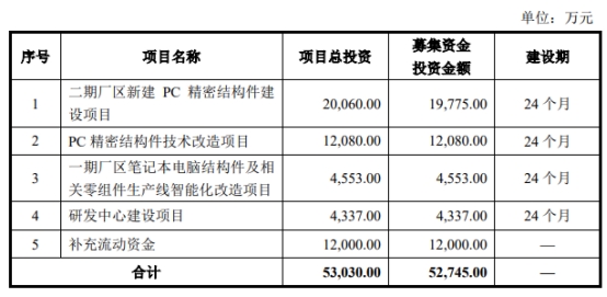 英力股份最终募集资金净额较原计划少14,423.55万元。公司2021年3月18日发布的,招股说明书显示,公司拟募集资金52,745.00万元,用于二期厂区新建PC精密结构件建设项目、PC精密结构件技术改造项目、一期厂区笔记本电脑结构件及相关零组件生产线智能化改造项目、研发中心建设项目、补充流动资金。
