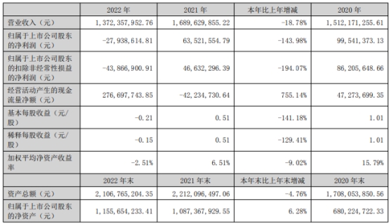 中国经济网北京4月6日讯英力股份(300956.SZ)于4月4日发布2022年年度报告,公司2022年实现营业收入13.72亿元,同比下降18.78%;归属于上市公司股东的净利润为-2793.86万元,同比下降143.98%;归属于上市公司股东的扣除非经常性损益的净利润为-4386.69万元,同比下降194.07%;经营活动产生的现金流量净额为2.77亿元,上年同期为-4223.47万元。