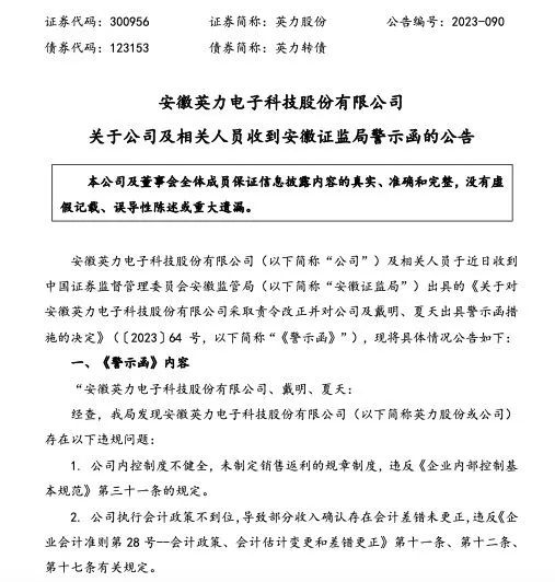 英力股份公告称,公司及相关人员于近日收到中国证券监督管理委员会安徽监管局(以下简称“安徽证监局”)出具的《关于对安徽英力电子科技股份有限公司采取责令改正并对公司及戴明、夏天出具警示函措施的决定》(〔2023〕64号,以下简称“警示函”)。