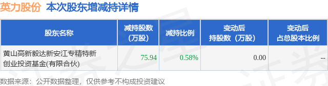 4月10日英力股份发布公告《英力股份:关于公司股东股份减持计划实施完毕的公告》,其股东黄山高新毅达新安江专精特新创业投资基金(有限合伙)于2023年12月14日至2024年3月6日间合计减持75.94万股,占公司目前总股本的0.5753%,变动期间该股股价下跌22.53%,截止3月6日收盘报13.79元。