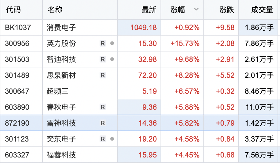 消费电子板块震荡拉升 英力股份涨超15%