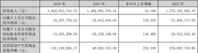 据公司2024年年报,2024年,公司营业收入实现18.43亿元,同比增长24.18%;归属于上市公司股东的净利润1026.77万元,同比增长129.33%;归属于母公司所有者的扣除非经常性损益的净利润1300.53万元,同比增长144.48%;经营活动产生的现金流量净额1.51亿元,同比增长224.19%。