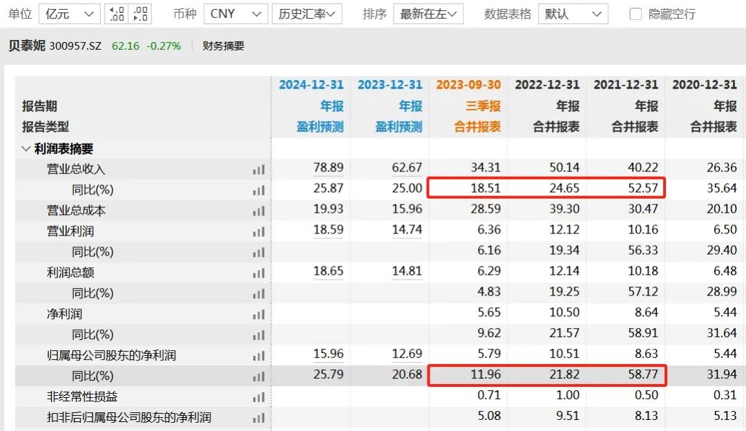 2021年至2023年前三季度,贝泰妮分别实现营收40.22亿元、50.14亿元、34.31亿元,同比增速为52.57%、24.65%、18.51%;同期归母净利润分别为8.63亿元、10.51亿元、5.79亿元,增速为58.77%、21.82%、11.96%。
