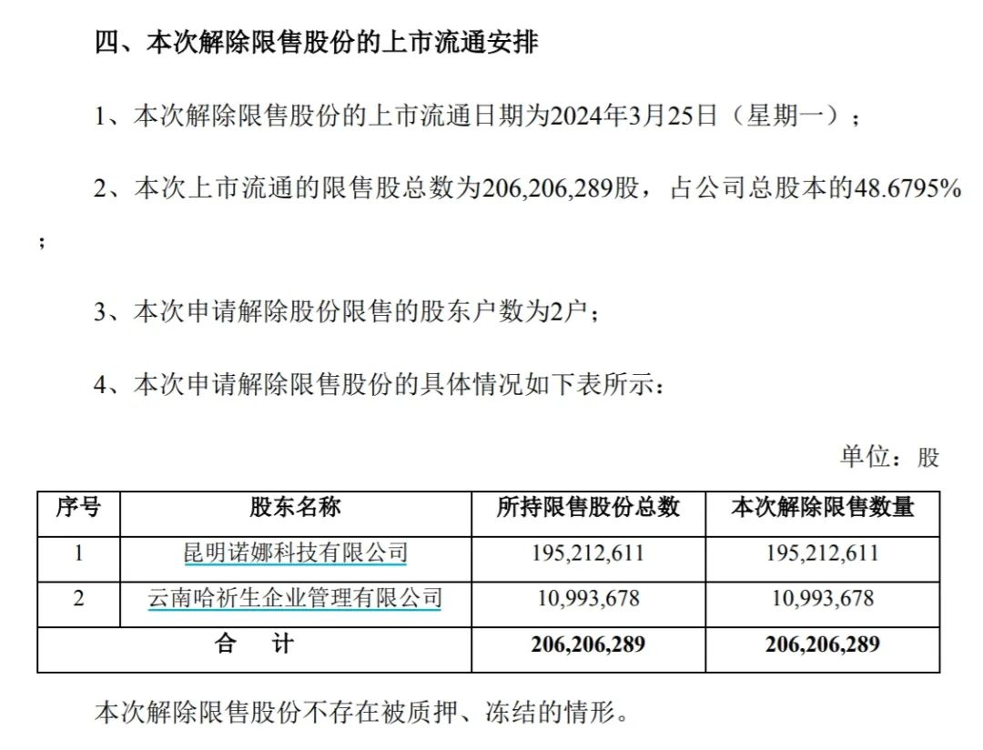 贝泰妮上周公告,3月25日,公司有2.06亿股首发限售股上市流通,占总股本比例为48.68%,股东数量为2户,分别为第一大股东昆明诺娜科技有限公司、第四大股东云南哈祈生企业管理有限公司。