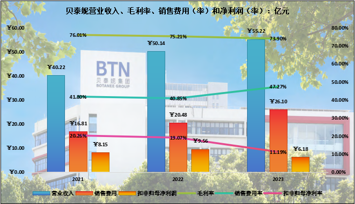 尽管贝泰妮在2023年的营业收入录得同比10.13的增长,但是毛利率的下降和销售费用(率)的激增导致全年扣非归母净利润同比大幅减少35.35%至6.18亿元,利润率水平同比下降7.88个百分点至11.19%,迅速脱离了优等生行列。