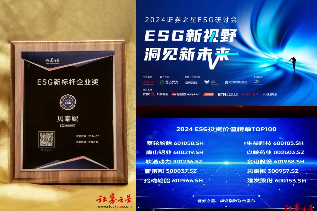 在本次会议中,贝泰妮集团【300957.SZ】凭借出色的ESG治理表现,荣登证券之星与华证指数联合发布的《2024年ESG价值投资TOP100榜单》,并获颁"ESG新标杆企业奖"。