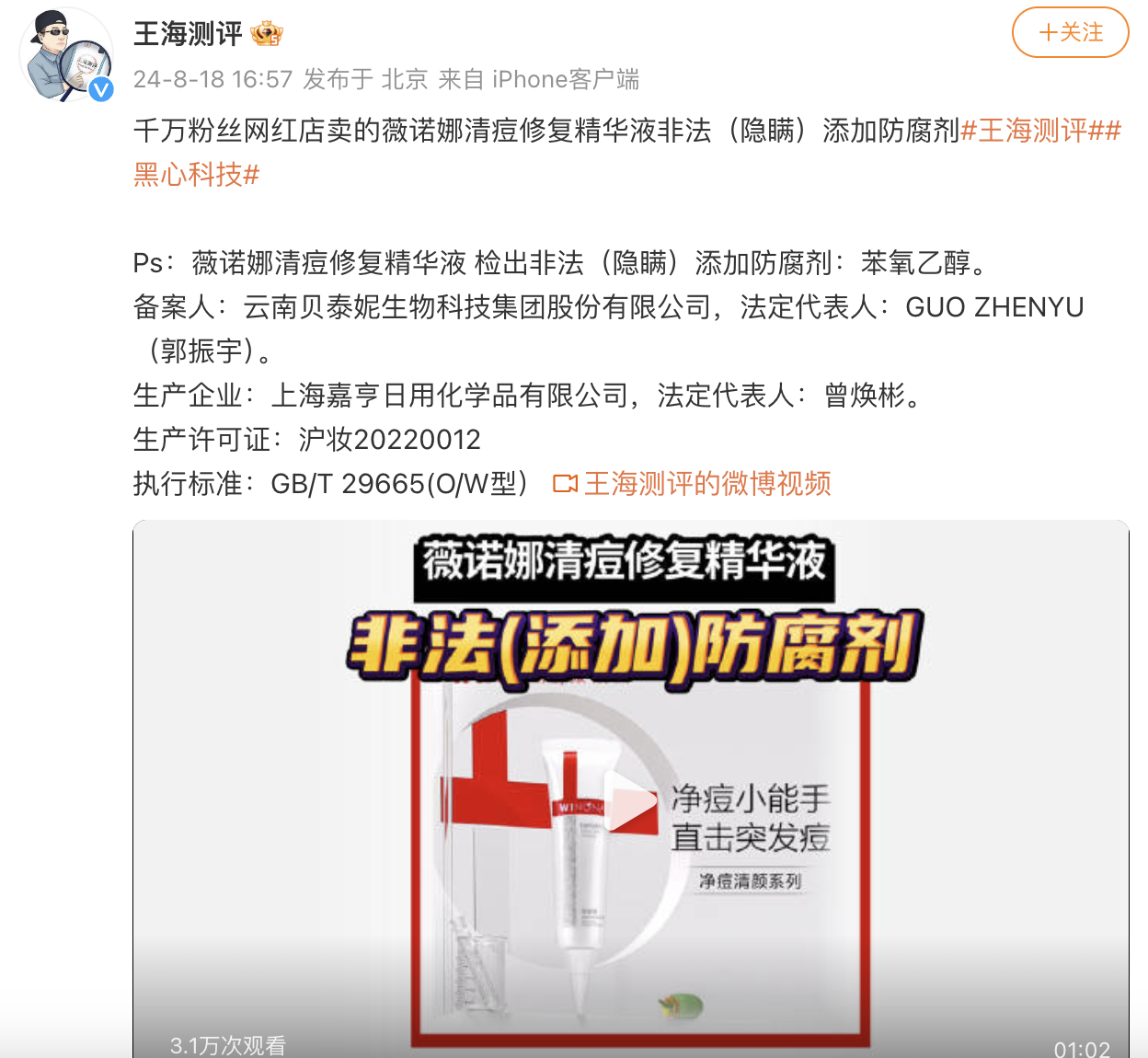 据“王海测评”发布的视频称,薇诺娜官方旗舰店卖的薇诺娜清痘修复精华液检出一种非法添加防腐剂——苯氧乙醇。