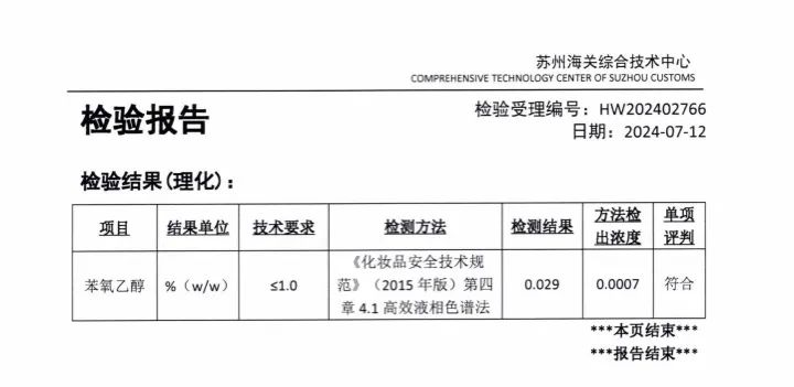 贝泰妮方面强调,薇诺娜清痘修复精华液中含有的苯氧乙醇是微量,在配方中无防腐剂的作用。为了证明,其还对外提供了一份由苏州海关出具、标注日期为7月12日的薇诺娜清痘修复精华液苯氧乙醇检测报告,相关截图显示该产品中苯氧乙醇的检测结果为0.029%。