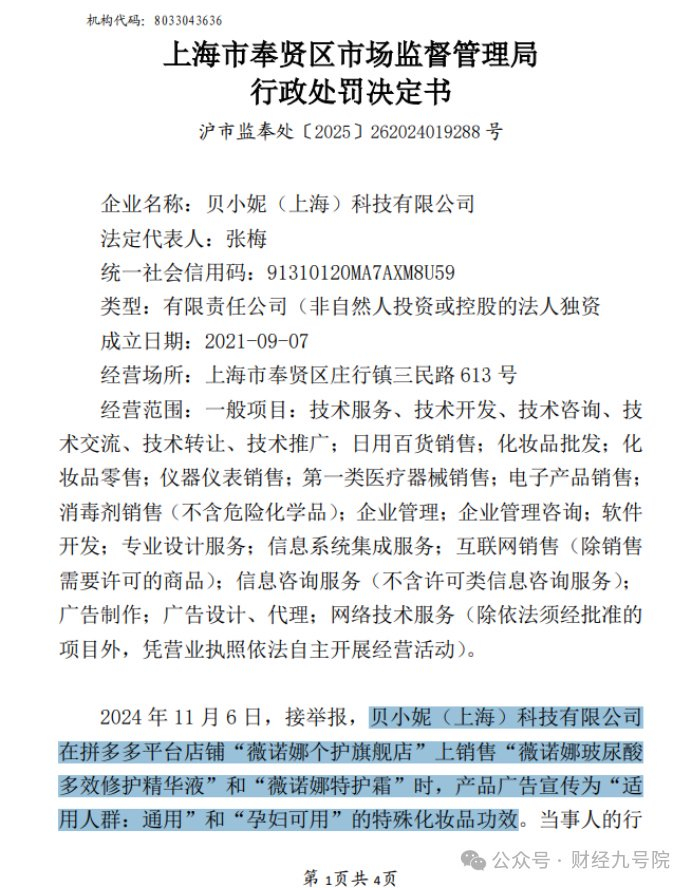 今年1月份,贝泰妮全资子公司贝小妮(上海)科技有限公司被上海市场监管部门行政处罚,经查,该公司在拼多多平台店铺“薇诺娜个护旗舰店”上销售销售“薇诺娜玻尿酸多效修护精华液”和“薇诺娜特护霜”时,产品广告宣传为“适用人群:通用”和“孕妇可用”的特殊化妆品功效,贝小妮销售的上述产品为普通化妆品,没有“孕妇可用”和“适用人群:通用”的特殊适用人群。属于虚假宣传,而被市场监管部门处以2万元罚款处罚。
