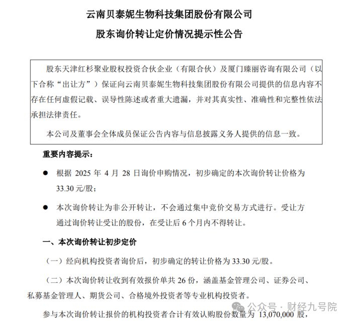 在今年4月份发布的上市公司公告中,贝泰妮的两位大股东天津红杉聚业股权投资合伙企业(有限合伙)及厦门臻丽咨询有限公司纷纷表示要询价转让一部分手中的股权,且根据公告显示,4月28日的询价转让价格为33.3元每股,作者查询了一下,当日贝泰妮的收盘价为39.7元每股,显然这波询价转让的折价率接近20%之高!