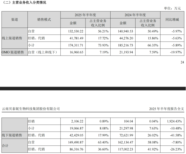 从销售渠道来看,公司主要通过线上、线下及OMO(线上融合线下)三类渠道开展业务。2025年上半年,线上渠道收入17.43亿元,同比下降5.89%;线下渠道收入4.24亿元,同比下降41.58%;OMO渠道收入1.91亿元,同比下降10.48%。三大渠道全面承压,尤其线下渠道受消费场景变化冲击最为严重。