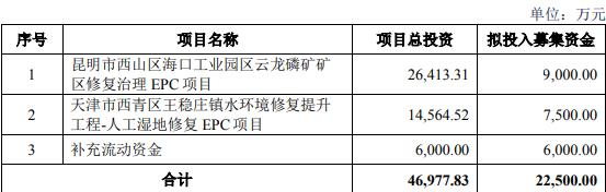 本次发行股票募集资金总额预计不超过22,500.00万元(含本数)且不超过最近一年末净资产百分之二十,扣除相关发行费用后的募集资金净额拟投资于昆明市西山区海口工业园区云龙磷矿矿区修复治理EPC项目、天津市西青区王稳庄镇水环境修复提升工程-人工湿地修复EPC项目、补充流动资金。