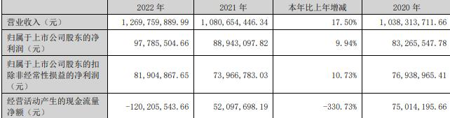 据建工修复2022年年报,报告期内,公司实现营业收入12.70亿元,同比增长17.50%;归属于上市公司股东的净利润9778.55万元,同比增长9.94%;归属于上市公司股东的扣除非经常性损益的净利润8190.49万元,同比增长10.73%;经营活动产生的现金流量净额-1.20亿元,同比减少330.73%。