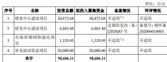 建工修复发行募集资金总额为304,214,943.60元,扣除发行费用后募集资金净额为263,351,225.87元。公司于2021年3月22日披露的招股书显示,公司拟募集资金58,606.11万元,全部用于修复中心建设项目、研发中心建设项目、市场营销网络强化项目、补充流动资金项目。