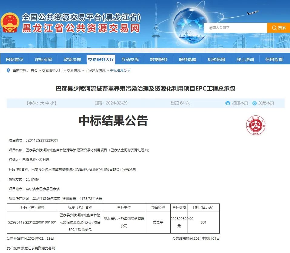 近日,深水海纳水务集团股份有限公司在黑龙江省巴彦县少陵河流域畜禽养殖污染治理及资源化利用项目EPC工程总承包的招标中,于众多竞争对手的角逐中脱颖而出,一举中标,中标金额为22289.98万元。本次中标项目是深水海纳集团积极响应“东北振兴”发展战略的又一重要突破,也是公司坚定贯彻“轻重平衡”发展战略的有力成果。