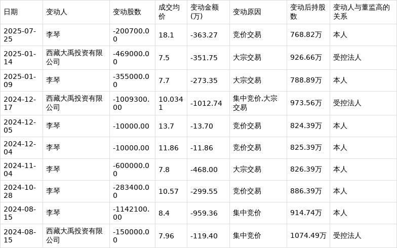 深交所公开信息显示,7月25日,深水海纳董事李琴在竞价交易公司股票,减持股数20.07万股,成交均价18.10元,变动金额363.27万元,变动后持股数为768.82万股。