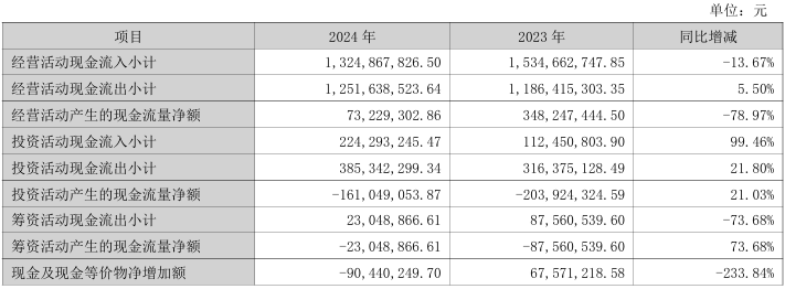 现金流方面,经营活动产生的现金流量净额较上年同期下降78.97%,主要系本期销售商品、提供劳务收到的现金减少所致;投资活动产生的现金流量净额较上年同期增长21.03%,主要系购建固定资产、无形资产和其他长期资产支付的现金减少所致;筹资活动产生的现金流量净额较上年同期增长73.68%,主要系分配股利减少所致;现金及现金等价物净增加额同比下降233.84%,主要系经营活动产生的现金流量净额减少所致。