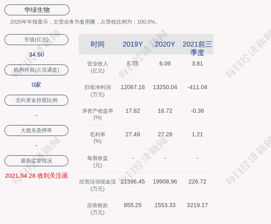 2020年年报显示,华绿生物的主营业务为食用菌,占营收比例为:100.0%。