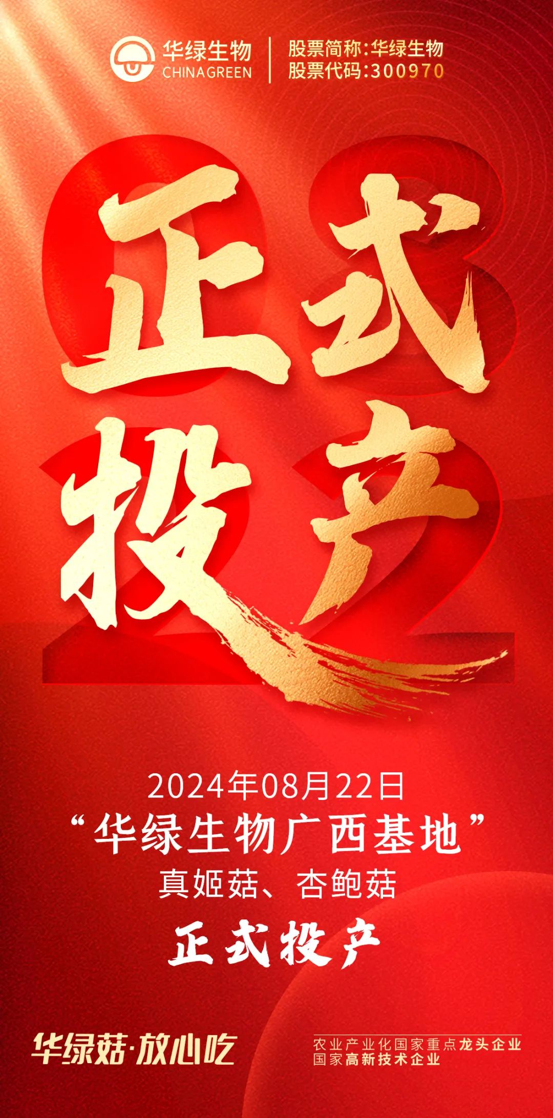 【喜讯】2024年8月22日8时日吉良辰,广西华绿生物科技有限责任公司真姬菇、杏鲍菇工厂金日投产大吉!