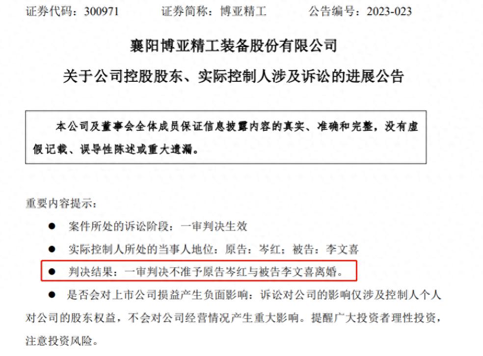 博亚精工 于2021年4月在深交所上市,上市还不到一年,在2022年1月,岑红便起诉李文喜,请求法院判令离婚并进行财产分割。之后,双方开启了近4年的离婚拉锯战。