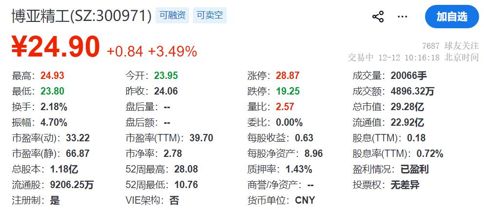 按照 博亚精工 目前每股24.9元,李文喜个人持股价值约7.6亿元,岑红个人持股价值约8366.4万元,两人持股价值超8亿元。