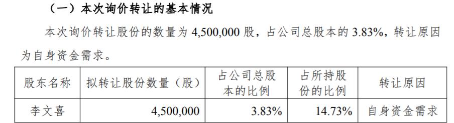 在今年12月1日,李文喜曾宣布持股询价转让计划,其自身资金需求拟转让 博亚精工 股份总数为450万股,占公司总股本3.83%。