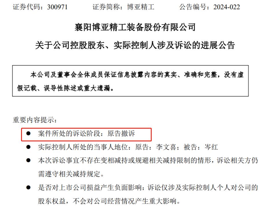 12月11日,襄阳 博亚精工 装备股份有限公司(以下简称“ 博亚精工 ”)发布关于公司控股股东、实际控制人涉及诉讼的进展公告。