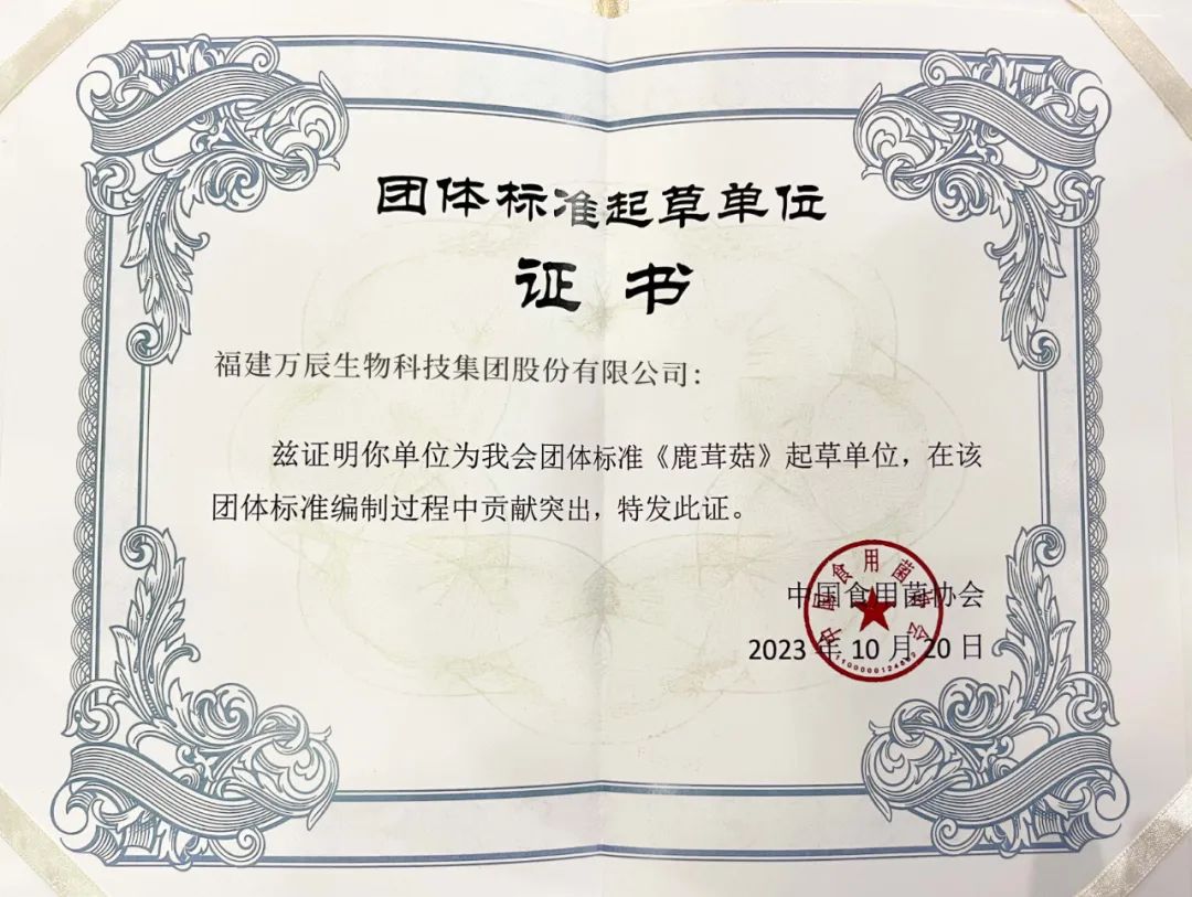 10月20日,万辰集团受邀参加第4届中国食用菌产业博览会,喜获中国食用菌协会颁发的鹿茸菇团体标准起草单位证书。