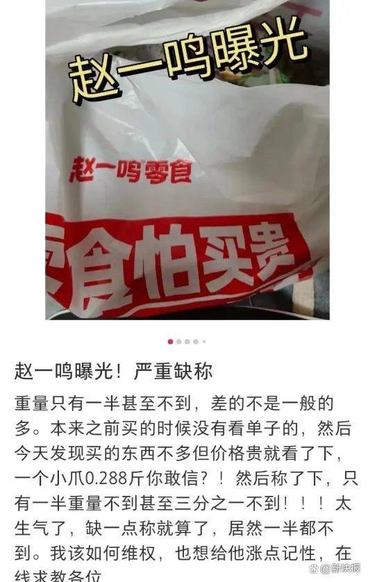据新快报报道,8月,有网友在社交平台发帖并附图称,自己去赵一鸣零食店挑选购买后,发现数量不多但是价格较贵,回家复秤后,发现严重缺秤。