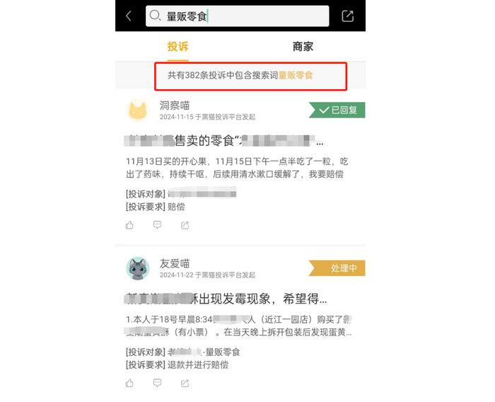 在黑猫投诉[下载黑猫投诉客户端]中,搜索量贩零食关键词,其下大多都是与食品安全有关的问题,什么真空袋破损、食品发霉、产品出现异物脏污并不少见;小红书上,也有多条曝光头部量贩零食旗下门店存在食品安全问题的帖子。