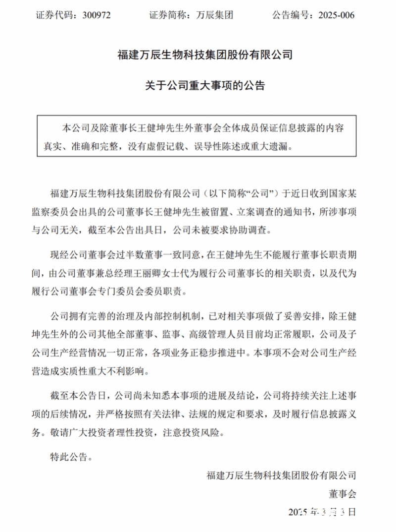 在王健坤无法正常履行董事长职责期间,将由董事兼总经理王丽卿女士暂时代理董事长一职,确保公司运营的连续性。万辰集团强调,此次事件不会对公司生产经营造成重大实质性不利影响。