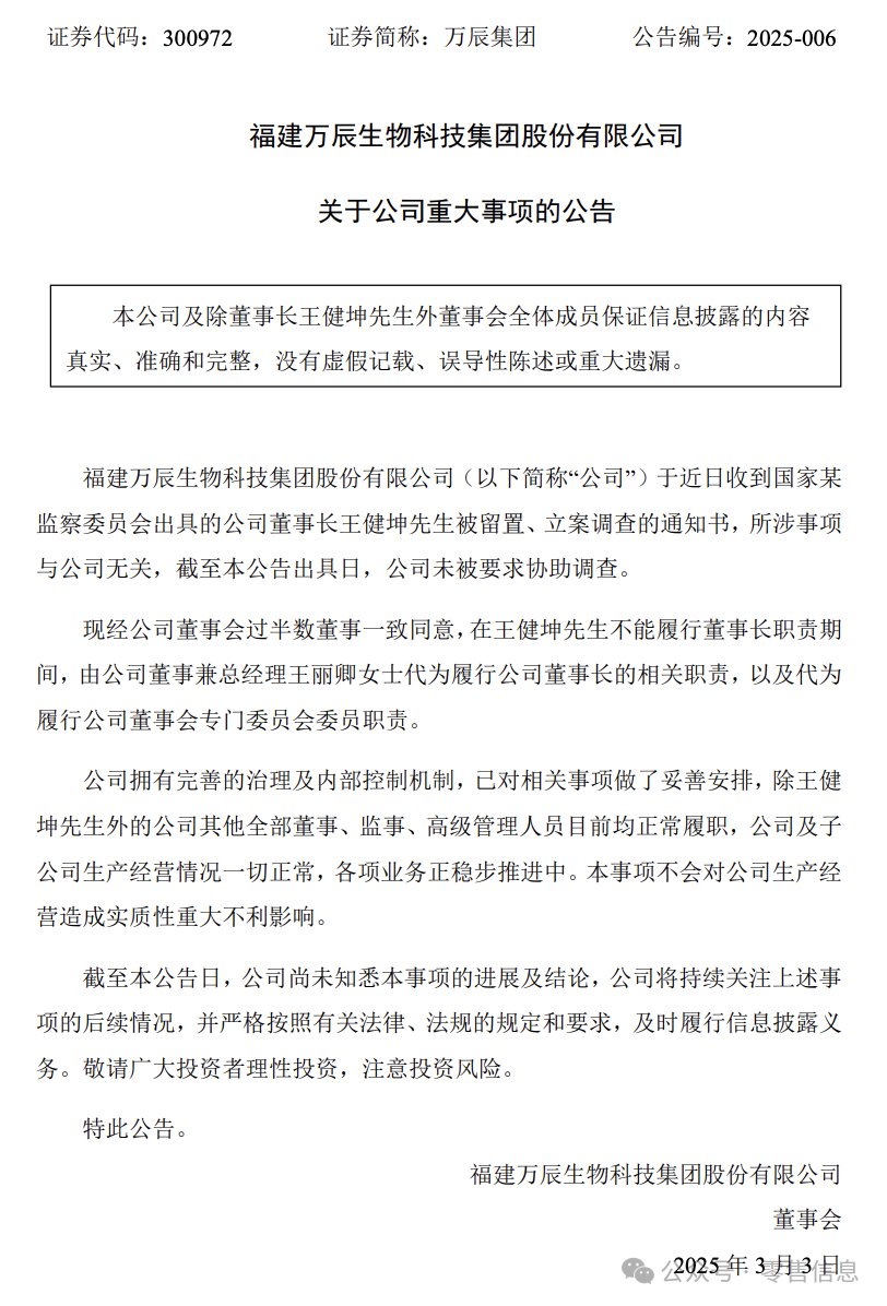 3月3日晚间,万辰集团(300972.SZ)发布公告称,该公司于近日收到国家某监察委员会出具的公司董事长王健坤被留置、立案调查的通知书,所涉事项与公司无关,截至本公告出具日,公司未被要求协助调查。
