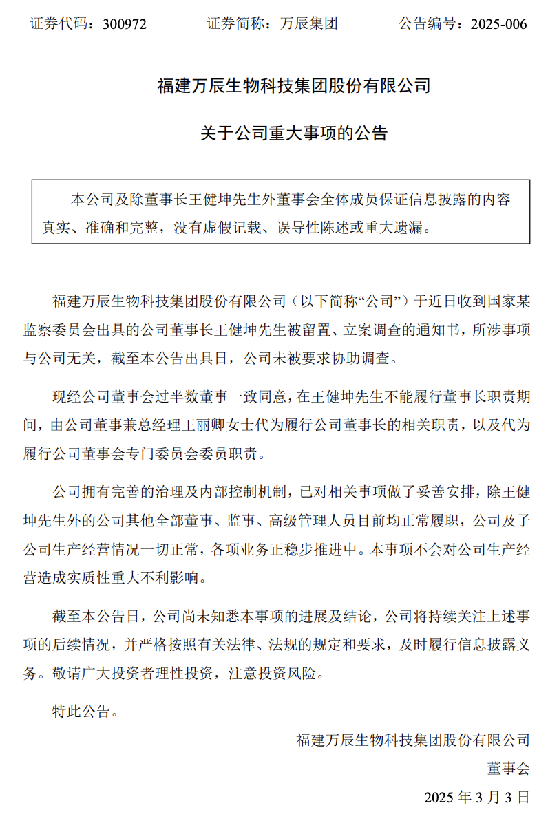 尽管公司在公告中强调“本事项不会对公司生产经营造成实质性重大不利影响”,但从企业高管动态与组织体系的深层关联来看,王健坤的突然被查,不仅导致公司管理层动荡(由其妹王丽卿暂代董事长职务),更折射出万辰集团在快速扩张过程中积累的结构性风险与深层次矛盾。