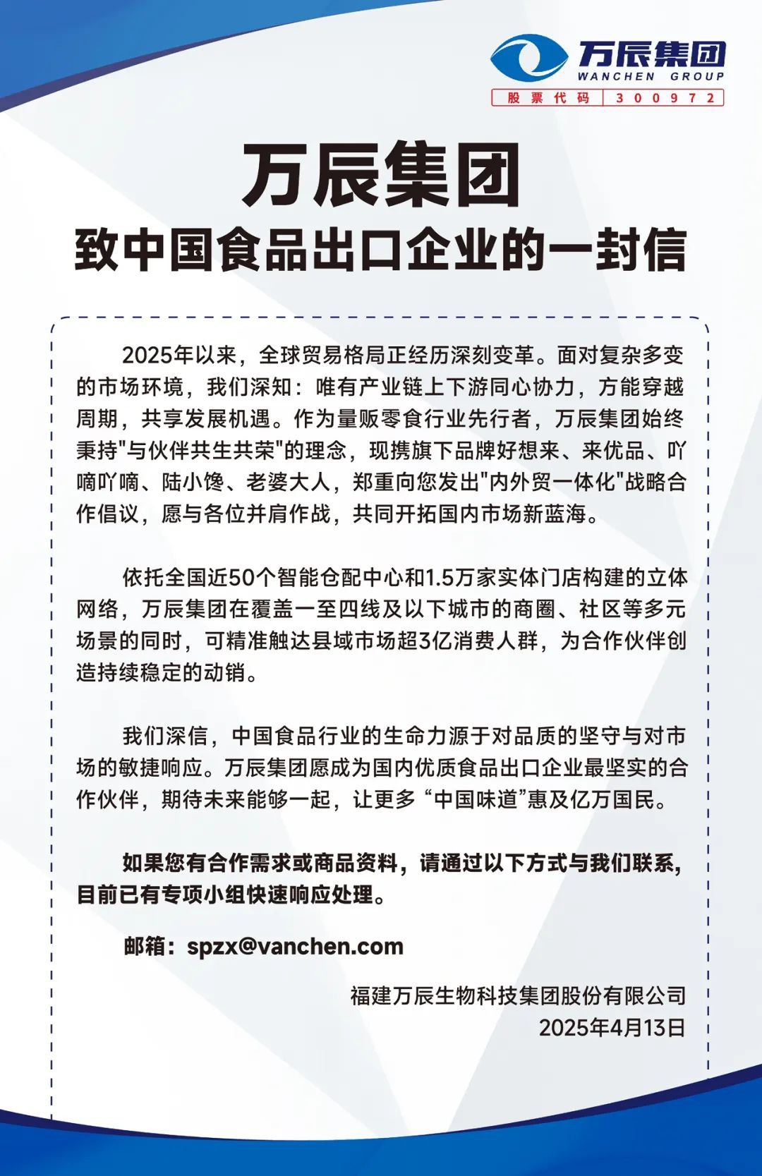 4月13日,万辰集团发布致中国食品出口企业的一封信。作为量贩零食行业的先行者,万辰集团始终秉持“与伙伴共生共荣”的理念。现携旗下品牌好想来、来优品、吖嘀吖嘀、陆小馋、老婆大人,郑重向您发出“内外贸一体化”战略合作倡议,愿与各位并肩作战,共同开拓国内市场新蓝海。依托全国近50个智能仓配中心和1.5万家实体门店构建的立体网络,万辰集团不仅覆盖了一至四线及以下城市的商圈、社区等多元场景,还能精准触达县域市场超3亿消费人群,为合作伙伴创造持续稳定的动销。