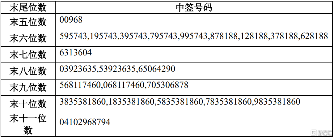 凡参与立高转债网上申购的投资者持有的申购配号尾数与上述号码相同的,则为中签号码。中签号码共有195,986个,每个中签号码只能认购10张(1000元)立高转债。
