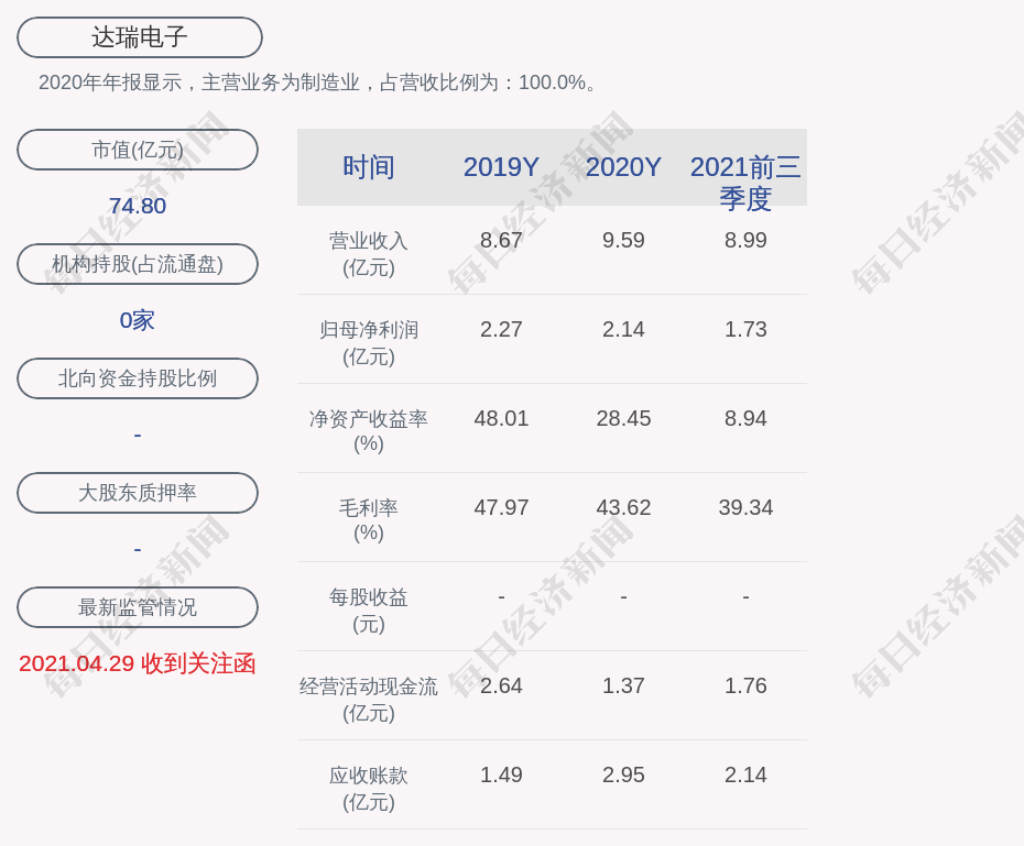 2020年年报显示,达瑞电子的主营业务为制造业,占营收比例为:100.0%。