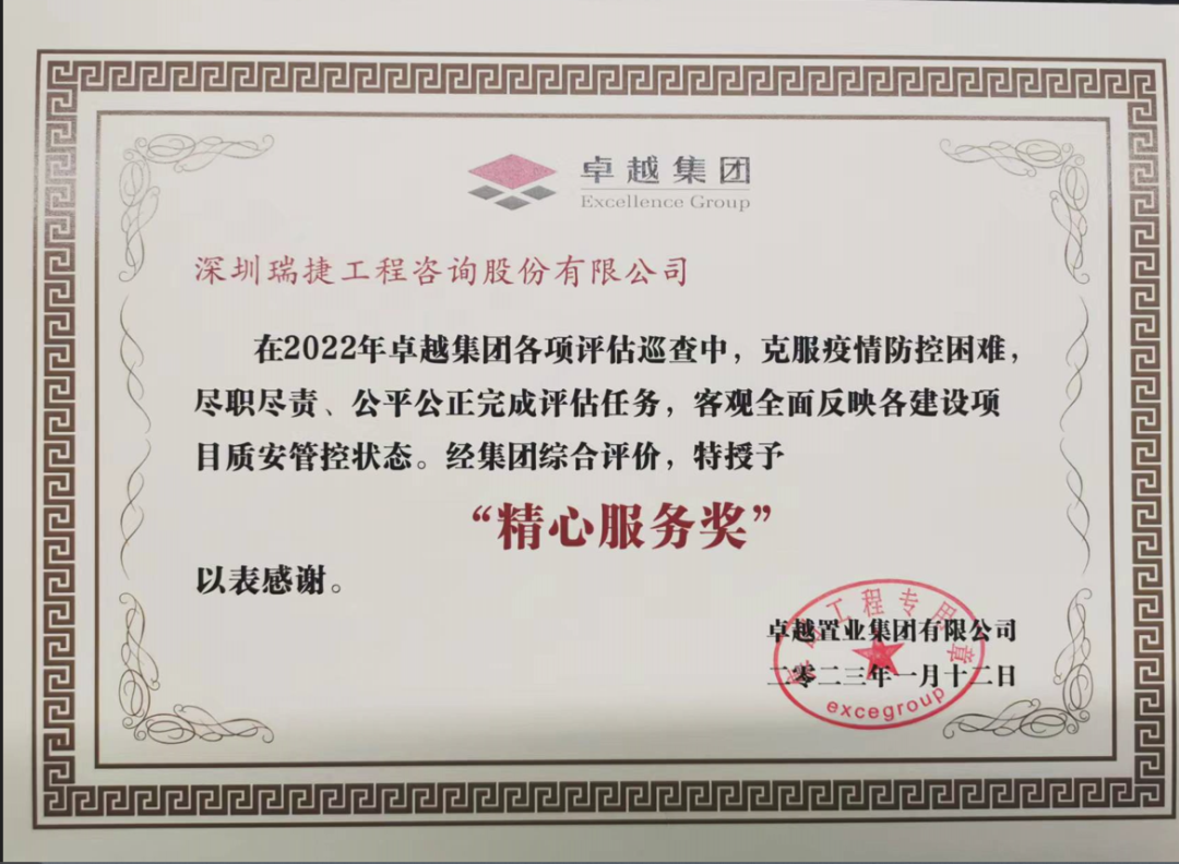 在2022年卓越集团各项评估巡查中,深圳瑞捷克服疫情防控困难,尽职尽责、公平公正地完成评估任务,客观全面反映各建设项目质安管控状态,荣获卓越集团授予“精心服务奖”。