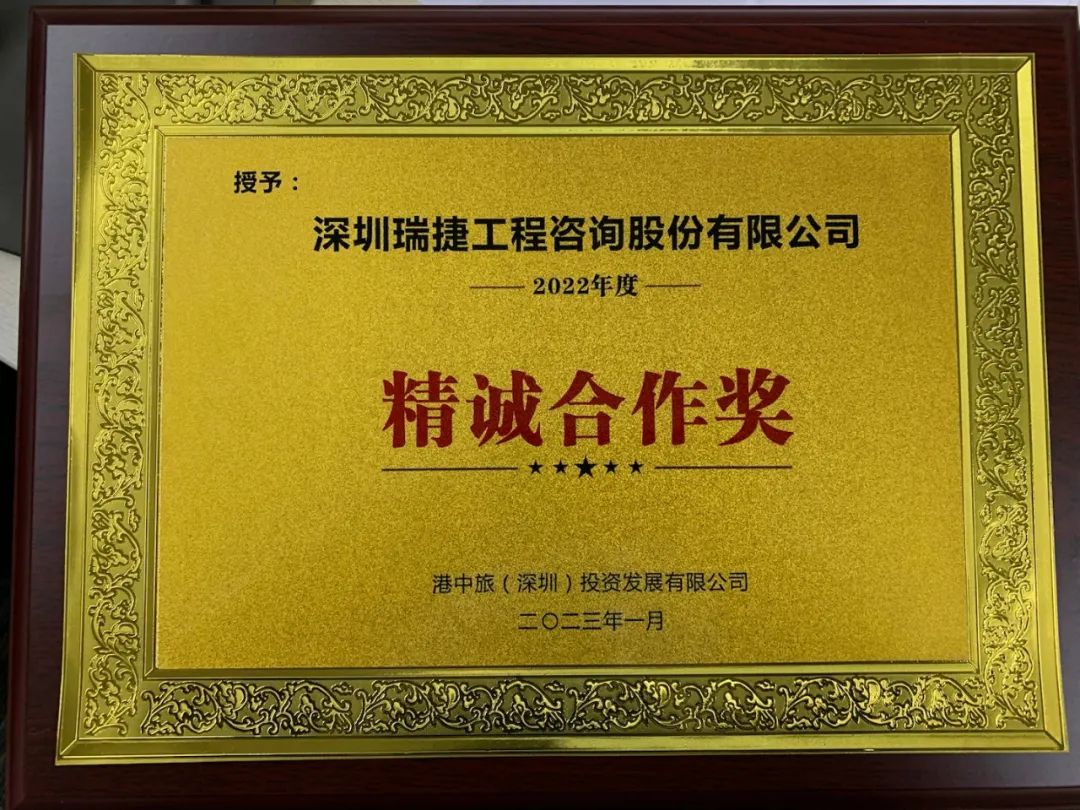 近日,深圳瑞捷荣获港中旅(深圳)投资发展有限公司授予的“2022年度精诚合作奖”。