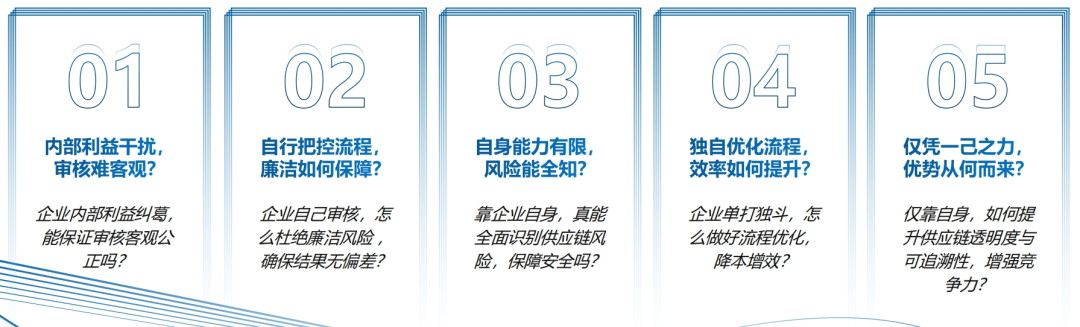 而且,企业在自行开展供应链审核时,往往会遇到一系列问题,包括内部利益干扰、廉洁风险难控、风险识别能力不足、流程优化与降本增效困难,以及供应链透明度和竞争力提升乏力的挑战,不仅影响审核的有效性,也限制了供应链的整体性能和企业的竞争力。