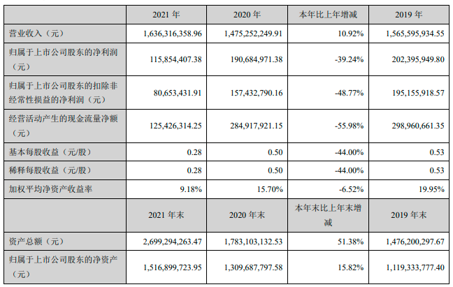 公告显示,2021年公司营业收入16.36亿元,同比增加10.92%;归属于上市公司股东的净利润1.16亿元,同比减少39.24%;归属于上市公司股东的扣除非经常性损益的净利润8065.34万元,同比减少48.77%;基本每股收益0.28元,同比减少44%。此外,公司拟每10股派发现金红利1元(含税)、不送红股、不转增。