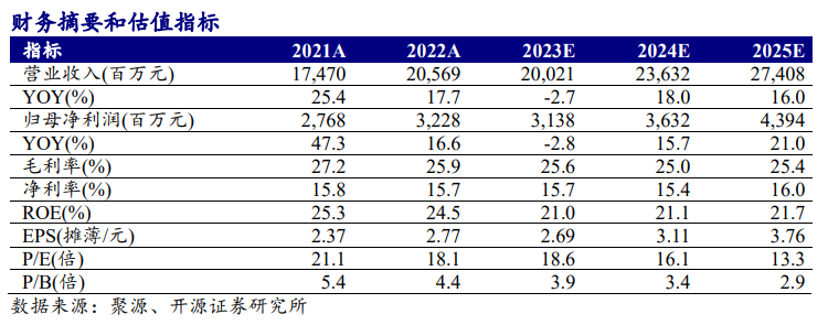 由于部分客户去库存影响订单,2023Q1-Q3收入143.08亿元(-6.93%),归母净利润22.87亿元(-6.49%),其中Q3收入50.97亿元(-6.9%)归母净利润8.31亿元(-5.9%)。美元口径,预计2023Q1-Q3收入下滑12%,其中2023Q3下滑10%左右、环比Q2基本持平。2023Q3利润符合预期,但考虑部分客户仍在积极调整库存,部分客户谨慎下单,我们下调盈利预测,预计2023-2025年归母净利润为31.4/36.3/43.9亿元(原为31.8/38.2/45.4亿元),对应EPS为2.7/3.1/3.8元,当前股价对应PE为18.6/16.1/13.3倍,下游去库进入中后期,预计Q4体现明显供应链转移效应,叠加出货进入低基数,业绩有望边际改善,维持“买入”评级。