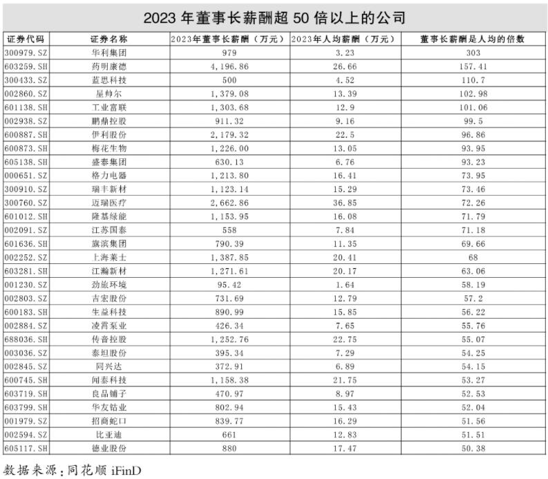 统计数据显示,2023年A股公司董事长薪酬超过公司人均薪酬10倍以上的共有1026家,超过50倍以上的有30家,超过100倍的有5家,分别是华利集团(300979)、药明康德(603259)、蓝思科技(300433)、星帅尔(002860)、工业富联(601138)。其中,华利集团董事长2023年薪酬979万元,是该公司人均薪酬3.23万元的303倍。