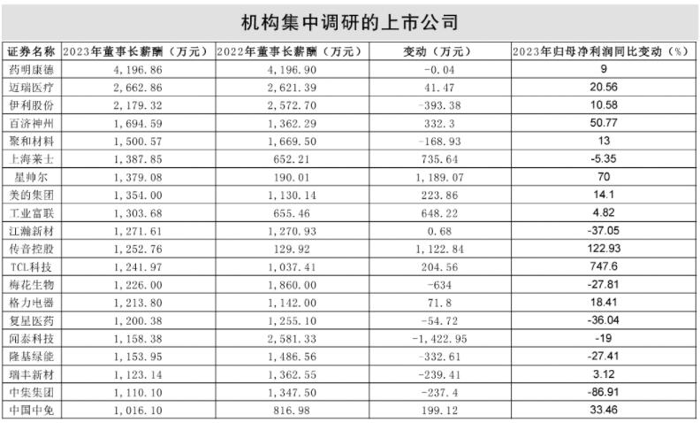 年报显示,药明康德2023年实现营收403.41亿元,同比增长2.51%;归母净利润96.07亿元,同比增长9%。公司高管年薪中,除董事长李革外,执行董事陈民章的薪酬也超过了千万元。而公司董监高的薪酬总计达9590.54万元,是5000多家A股公司中,董监高薪酬给付最多的公司之一。