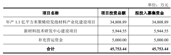 祥源新材2021年3月30日披露的招股书显示,公司拟募集资金45,753.44万元,计划用于年产1.1亿平方米聚烯烃发泡材料产业化建设项目、新材料技术研发中心建设项目、补充营运资金。