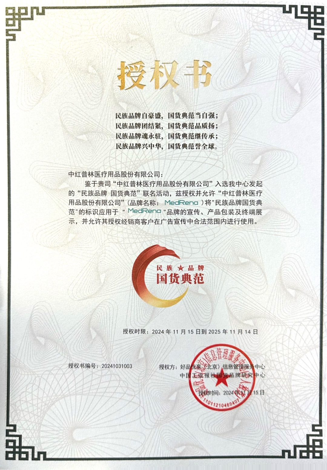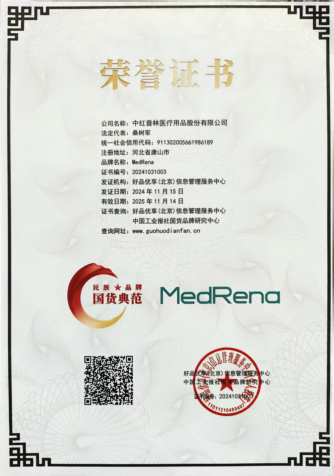 2024年11月9日,由中国工业报社品牌研究中心主办的“民族品牌·国货典范”甄选活动,在北京友谊宾馆荣耀启幕。中红医疗旗下深圳迈德瑞纳生物科技有限公司(以下简称迈德瑞纳),荣获“民族品牌国货典范”称号。