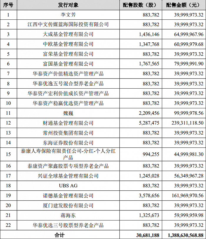 苏文电能12月13日公告,定增募资已完成,募资总额13.89亿元,发行数量为3068.0万股,增发价格为45.26元/股。发行对象合计22名,财通基金获配2.39亿元,诺德基金获配1.62亿元。