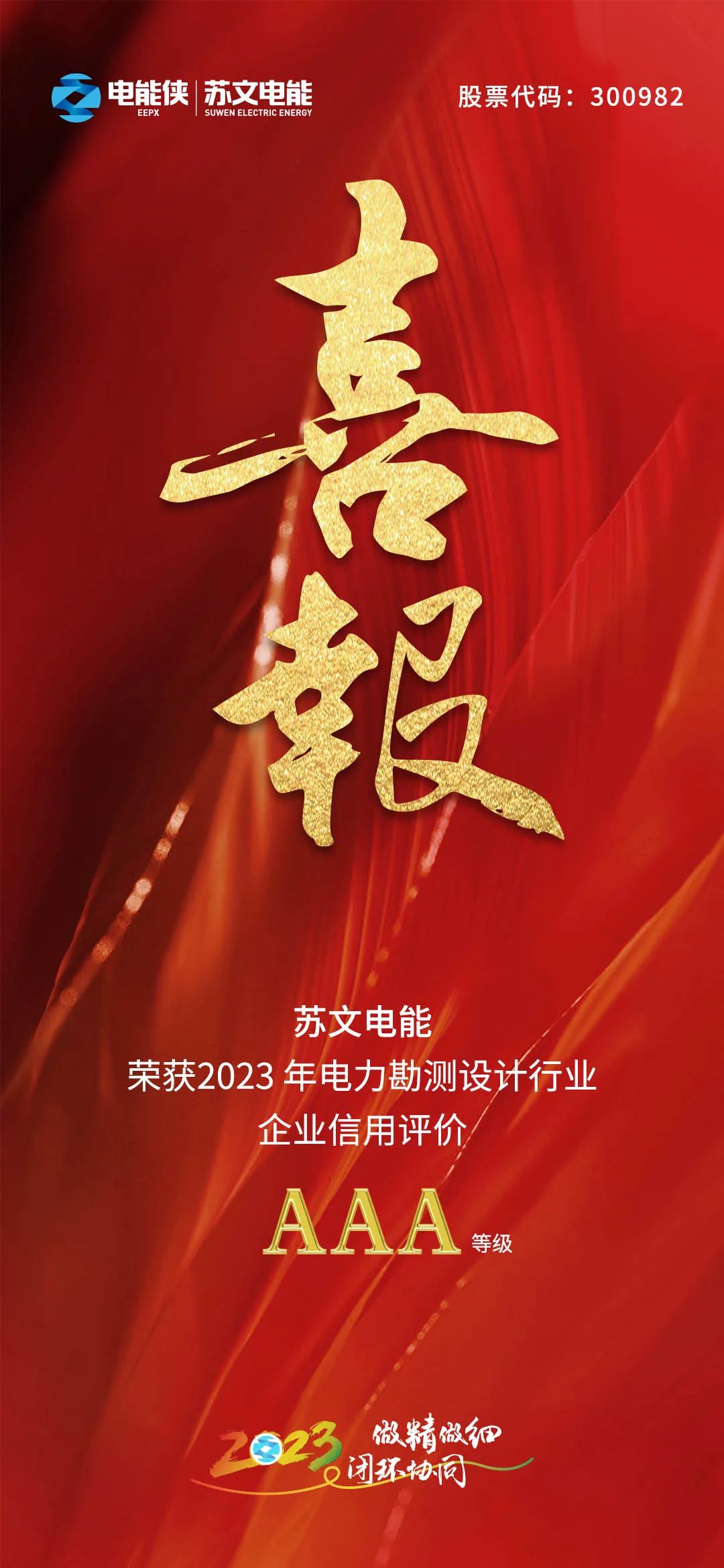 苏文电能科技股份有限公司荣获2023年电力勘测设计行业企业信用评价“AAA评价等级”。