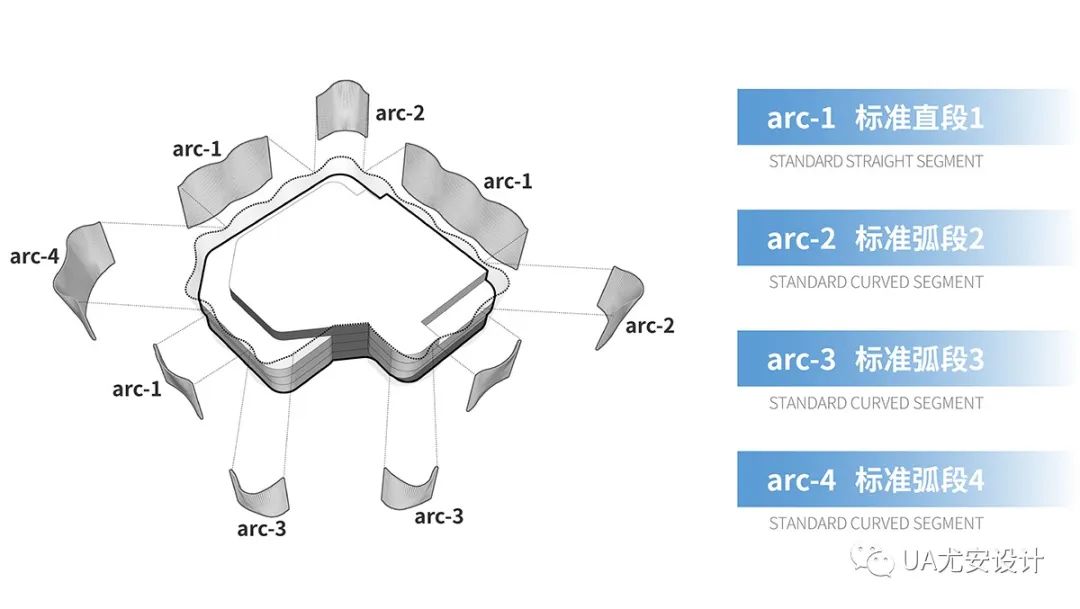为进一步有效控制外表皮的韵律感、保证复杂造型的施工现场的可控性,设计通过参数化设计将不规则的金属幕墙解读、拆析为四个标准单元,在有序组合手法下构成三维造型。立面表皮的单元化可复制,也进一步的节省了材料。